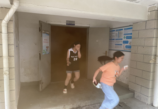 6月7日下午4:00时,全体演练工作人员到位,学生进入各自宿舍就位。为取得良好演练效果,我处工作人员点燃烟雾,模拟真实的地震火灾场景。演练开始,第一声哨响,全体学生均意识到突发灾难来临,立即在墙角及桌边蹲在躲避,5秒后第二声哨响,全体学生捂住口鼻,按照逃生路线有序的、迅速的逃离宿舍并撤离到安全区域。本次演练总共用时1分49秒,达到演练预期效果。