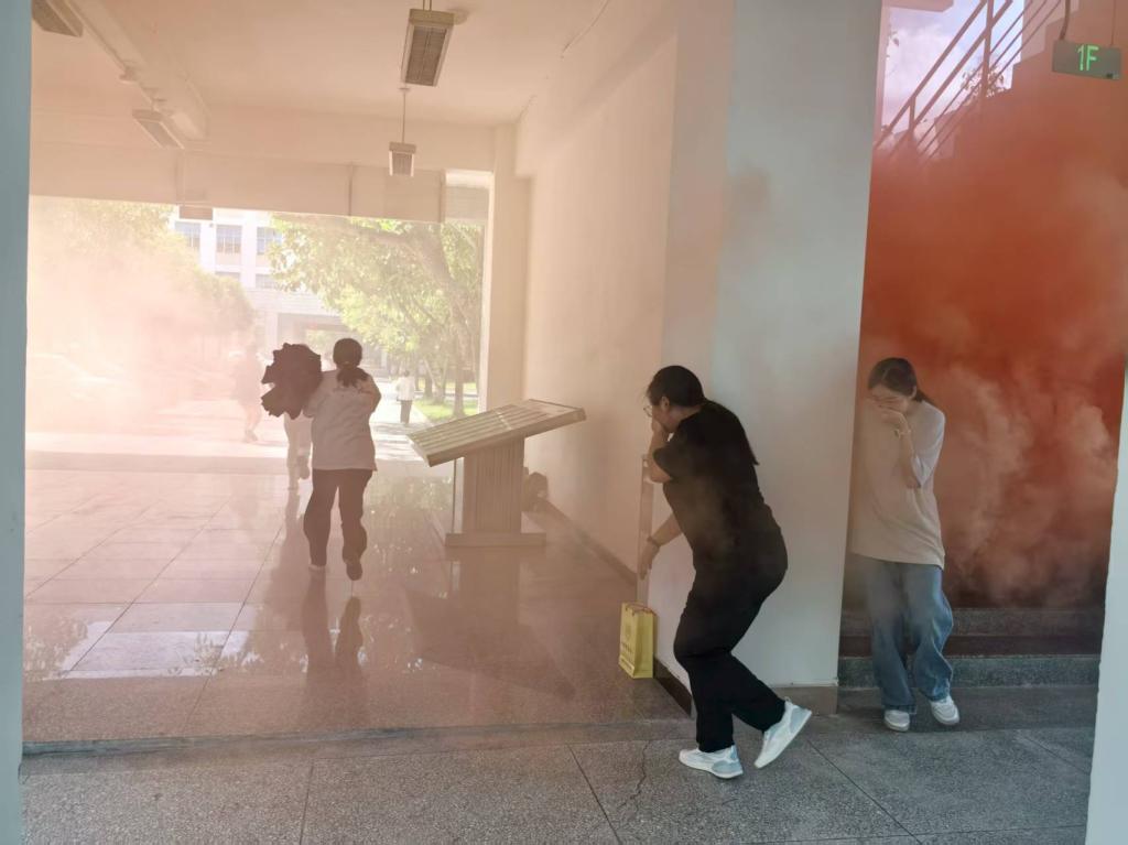 第二部分应急逃生演练(消防、地震)。演练开启前安全工作处林泽文先详细介绍消防器材的使用、演练程序、疏散信号、疏散路线、疏散顺序等注意事项,并强调在疏散过程中切勿拥挤、推搡导致踩踏事件发生。各位置工作人员提前到岗,认真履责,确保撤离安全有序。演练开始,安全工作处演练工作组接到演练指令后,模拟燃放烟雾,工作人员组织学生依次从实训(验)室撤出,按照指定路线,分别有序从楼梯通道内侧撤离,做到弯腰、捂口鼻、迅速有序,到一层大厅集合并清点人数。