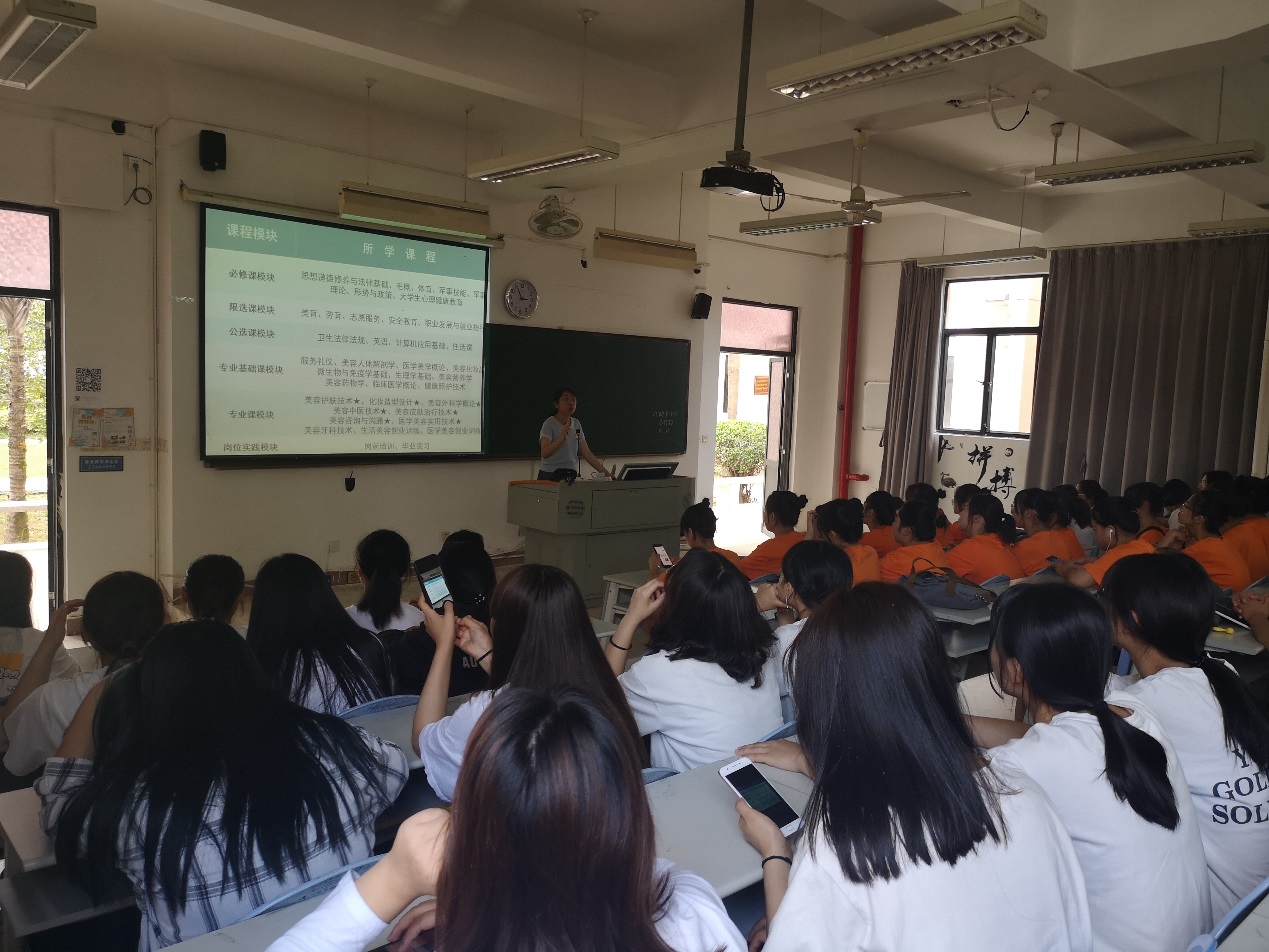 2019年10月17日下午,为了提升高职一年级新生对自己所学专业的了解,我校医学美容技术专业学科带头人吴明老师给2019级医学美容技术专业新生进行专业介绍,同时参会的还有医学美容与中医养生教研室主任杨笑老师和专任教师李芳琴老师。吴明老师主要从专业简介、培养目标、课程设置、师资力量、就业方向、可考取的资格证以及历届医学美容技术专业获奖情况等方面介绍了医学美容技术专业,详细说明了专业的发展特色与方向。吴明老师对新生们提出几点希望:希望同学们在学习期间,能有坚定的理想信念,努力把专业课程学好,夯实基础;同时希望同学们能在未来的学习生活中积极参加专业相关的比赛,努力成为技术精湛的高技术人才。最后的答疑解惑环节,同学们积极地提出对未来学习方向的问题和见解。