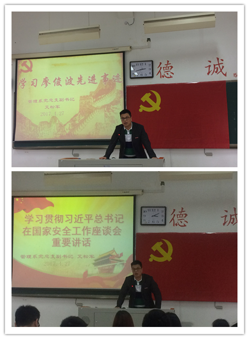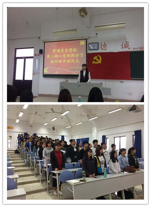 4月27日下午,管理系分党校第二期培训班开班仪式在教学楼309教隆重举行。管理系党总支艾松军副书记,党总支组织委员、学生党支部书记揭金花老师,党总支宣传委员吴晶老师,教工党支部书记、团总支书记邱麟老师,团总支副书记冯瑞华老师以及15级、16级部分学生先进分子参加培训班开班仪式。