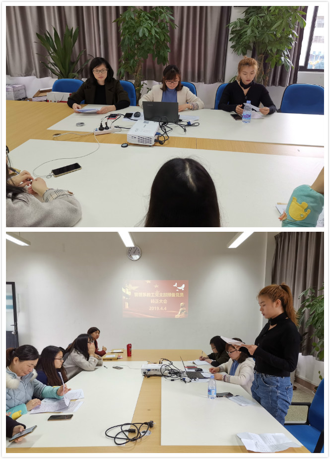 4月4日,管理系教工党支部举行预备党员转正大会,大会讨论并审议预备党员朱紫琼(16美容301)同志转为正式党员问题,全体支部党员参加会议。