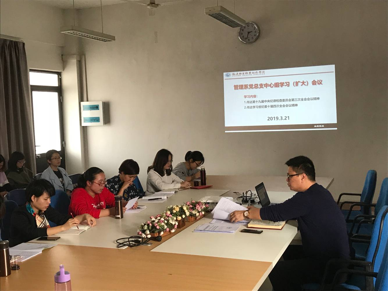 3月22日,管理系党总支召开中心组学习扩大会,学习十九届中央纪委三次全会精神、中共福建省纪委十届四次全会精神,此次中心组学习由管理系党总支书记艾松军主持。