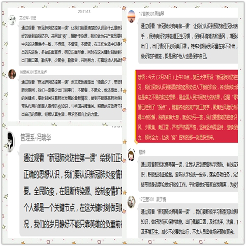 管理系艾松军书记表示:“新冠肺炎防控第一课”让我们能更清楚的认识什么是新冠肺炎以及如何更好的做到自我防护。共同战"疫",阻断传染源,我们做为共产党员要听党话,时刻与党中央的决策保持一致,不传谣、不信谣、不造谣,在工作生活中以身作则,充分发挥党员的先进性,多做正面宣传,树立正面形象,同时在这关键时刻做到守规矩、严纪律、出门戴口罩、勤洗手、少聚会、勤报告,共同努力,打赢这场人民战争。