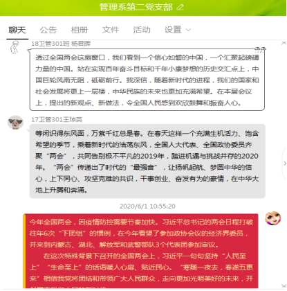 为期7天的全国两会胜利闭幕,为了全面的了解两会时政热点和政策导向,全面学习政府工作报告等文件。2020年6月1日,管理系第二党支部依托学习强国平台两会专题开展两会精神线上学习分享会。