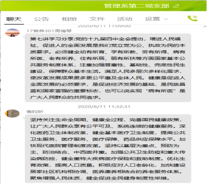 6月11日,管理系第二党支部借助学习强国平台学习了十九届四中全会精神——中国制度十三讲中的第七讲:坚持和完善统筹城乡的民生保障制度,满足人民日益增长的美好生活需要。党的十九届四中全会提出,必须健全幼有所育、学有所教、劳有所得、病有所医、老有所养、住有所居、弱有所扶等方面国家基本公共服务制度体系,注重加强普惠性、基础性、兜底性民生建设,保障群众基本生活,满足人民多层次多样化需求,使改革发展成果更多更公平惠及全体人民。