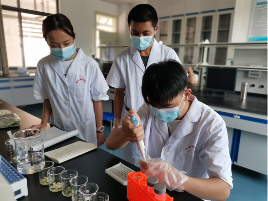 食品质量检测小组对两个食堂的餐饮卫生进行督查,并随机抽取第一食堂当日采购且切洗浸泡后的空心菜、大白菜、秋葵、豆角等蔬菜,随机抽取第二食堂当日采购且切洗浸泡后的茄子、油麦菜、玉米、小白菜等蔬菜,随机抽取5份食堂正在使用的食用油,采用酶抑制率法检测蔬菜中的农药残留、食用油酸价和过氧化值。检测工作在管理系安全性评价实训室开展,由党员教师揭金花、李丹及预防医学专业学生入党积极分子共同完成。