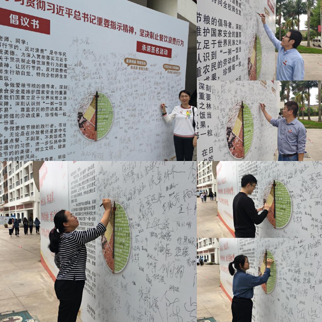 珍惜粮食,光盘行动我践行。师生积极响应习近平总书记对制止餐饮浪费行为重要指示精神倡议,签名承诺厉行节约珍惜粮食,用实际行动践行光盘。米粒虽小,尤见礼义廉耻;节俭事微,可助兴国安邦,我们要树立珍惜粮食的意识,践行爱惜粮食的理念。节约粮食,从我做起,从现在做起!