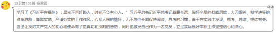学生党员杨君晖表示:星光不问赶路人,时光不负有心人。”习近平总书记着眼长远、胸怀全局的战略思维,大刀阔斧、科学决策的改革思路,脚踏实地、严谨务实的工作作风,心系人民的情怀,让我对共产党人的初心和使命有了更真切和深刻的感悟,同时也激发自己作为一名预备党员,立足实际做好本职工作坚定信心和决心。