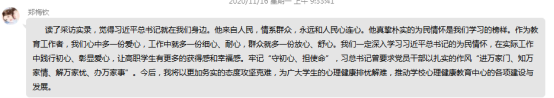 教师党员郑梅钦表示,读了采访实录,习近平总书记真挚朴实的为民情怀是我们学习的榜样。作为教育工作者,我们心中多一份爱心,工作中就多一份细心、耐心,群众就多一份放心、舒心。深入学习习近平总书记的为民情怀,在实际工作中践行初心、彰显爱心,让高职学生有更多的获得感和幸福感。