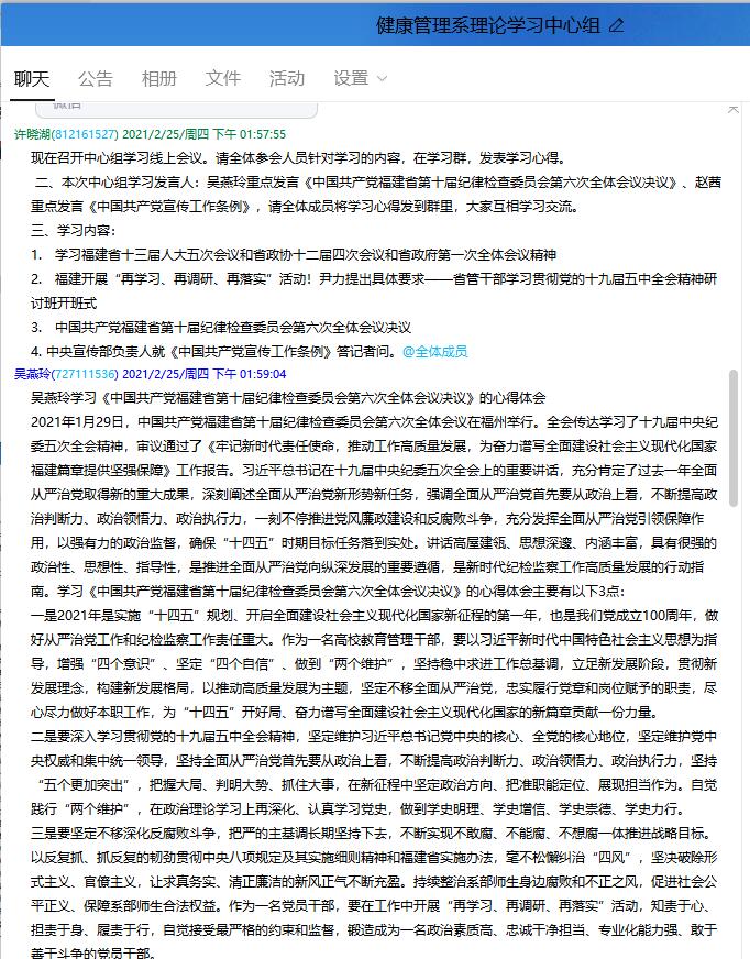 2021年2月25日,健康管理系理论学习中心组召开线上学习会议,本次中心组学习重点学习《中国共产党福建省第十届纪律检查委员会第六次全体会议决议》、《中国共产党宣传工作条例》。