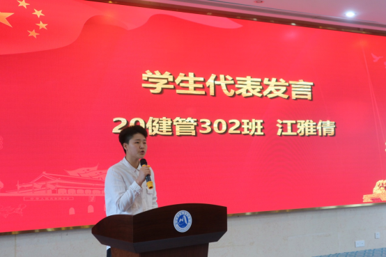 随后,由本期学员代表20健管302班江雅倩同学上台发言,江雅倩同学表示,作为新时代的先进青年、先进大学生,我们应该从自身做起:在生活中严格要求自己;不断加强科学文化知识的学习,提高自己的人文素养,掌握为人民服务的本领;同时提升文化自信,进入社会后,能将自己的所学应用到工作实践中,要积极响应国家的号召,献出自己的绵薄之力。
