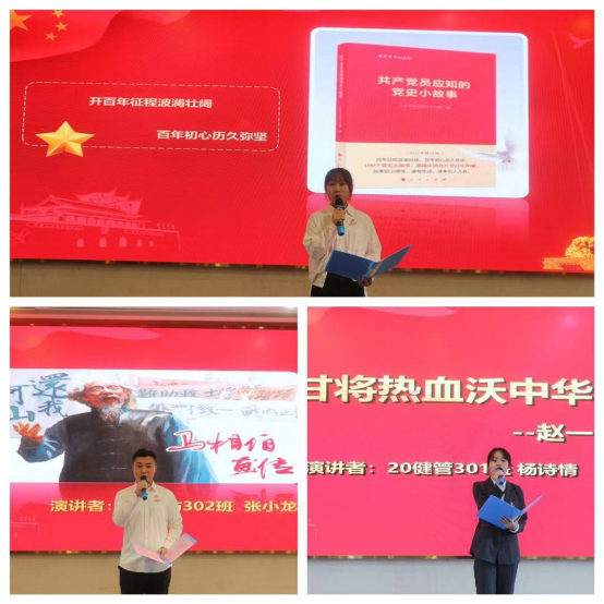 学党史,党员精神代代相传,辈辈相承。仪式伊始,全体师生起立,奏唱国歌。党校是培养忠于党的事业合格接班人的地方。学党史,悟心得,以传承红色基因——学员微讲堂成员演讲开始本次结业仪式第一个环节。19美容301班钟侣欣同学:“党史小故事——周恩来订立修养七则”;19预防302班张小龙同学:“教育史筚路蓝缕的先哲”;20健管301班杨诗情同学:“甘于热血沃中华”。三位同学通过不同的演讲方式深情地述说了一代又一代共产党人不懈奋斗、勇敢逐梦的壮丽史诗,唤醒了在座无数学员心中的热血与激情。