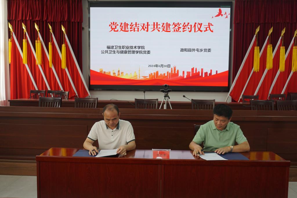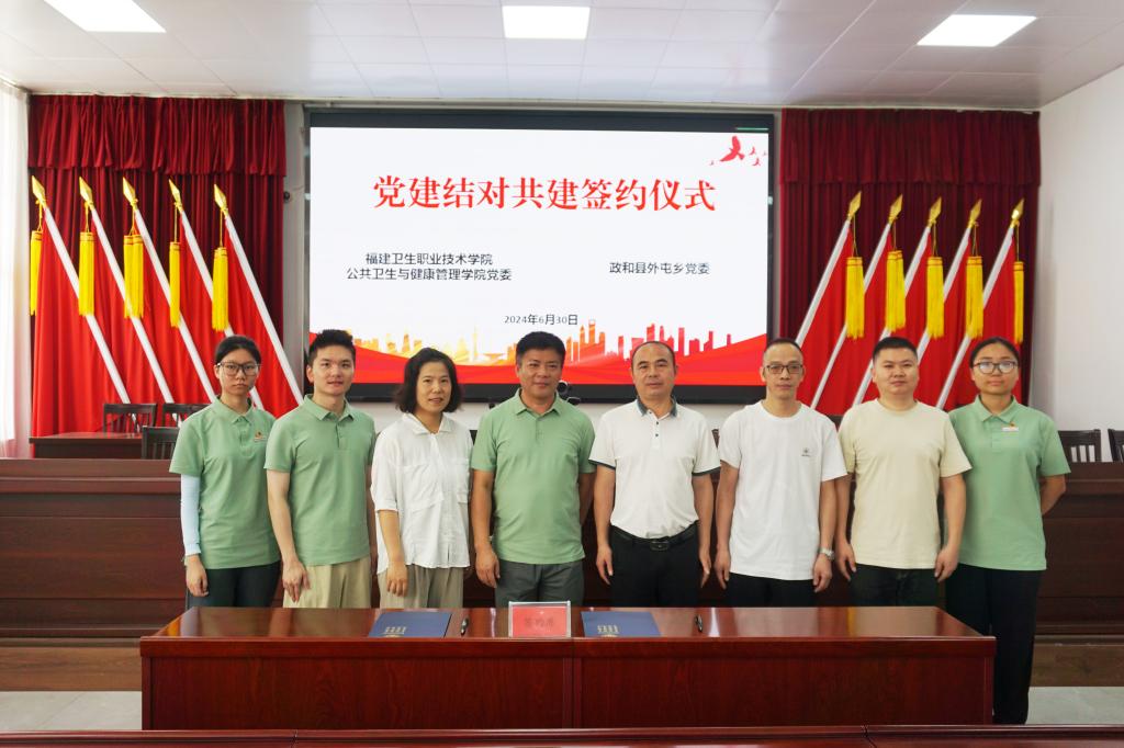 6月30日,公共卫生与健康管理学院党委与政和县外屯乡党委党建结对共建仪式在外屯乡举行。外屯乡党委书记陆海、卫生院院长郑胜伟、学院院长庄海林、副书记董东等参与签约仪式。