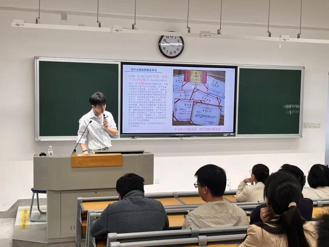 在随后的分享会上,黄德兴与2025级医学检验技术专业学生进行了“与学长话职业成长”分享交流。他不仅分享了多位同窗校友在各自岗位上的卓越业绩,更结合自身从青涩学子迅速成长为岗位能手的经历,围绕核心能力储备、清晰职业规划与持续自我提升等问题,倾囊相授其从校园走向职场的心得感悟。在互动环节,同学们围绕岗位认知、职业规划等困惑与黄德兴学长进行深入交流,现场气氛热烈,思想的火花不断碰撞。