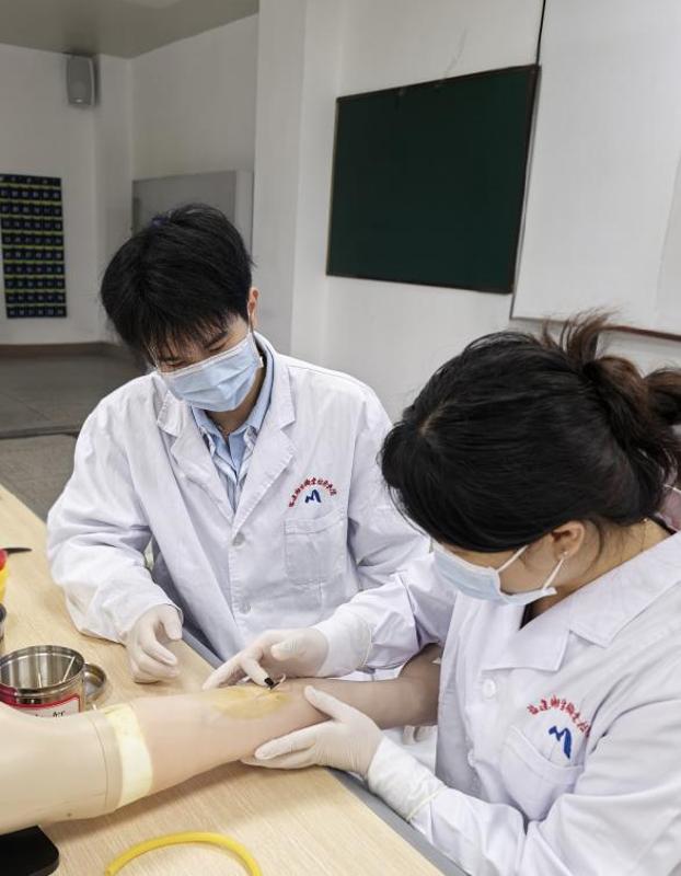 活动伊始,黄德兴首先展示了堪称“指尖艺术”的“飞针采血”无痛穿刺技能。他手法精准、动作行云流水,为正在备战技能竞赛的选手们示范了这一技术的核心要领与实战心得。“看到学长如此娴熟精湛的操作,我才深刻体会到‘台上一分钟,台下十年功’的真正内涵。”一名备赛学生在观摩后由衷感慨。这场“看得见”的技能展示,将课本上的静态知识转化为动态的实践智慧,生动诠释了工匠精神的内涵。