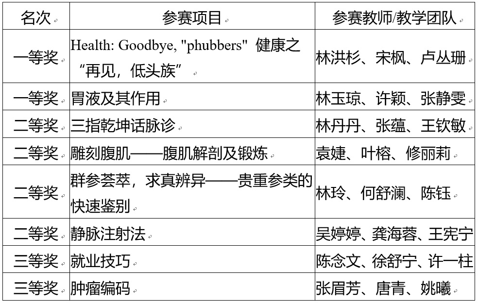 6月初,由福建省教育厅举办“网龙杯”2019年福建省职业院校教师教学能力比赛中,我院参赛项目从156件参赛项目中脱颖而出,其中林洪杉(主讲)、宋枫、卢丛珊团队的课程《Health: Goodbye, "phubbers" 健康之“再见,低头族”》和林玉琼(主讲)、许颖、张静雯团队的课程《胃液及其作用》荣获高职组一等奖;林丹丹(主讲)、张蕴、王钦敏团队的课程《三指乾坤话脉诊》,袁婕(主讲)、叶榕、修丽莉团队的课程《雕刻腹肌——腹肌解剖及锻炼》,林玲(主讲)、何舒澜、陈钰团队的课程《群参荟萃,求真辨异——贵重参类的快速鉴别》和吴婷婷(主讲)、龚海蓉、王宪宁团队的课程《静脉注射法》荣获高职组二等奖;陈念文(主讲)、徐舒宁、许一柱团队的课程《就业技巧》,张眉芳(主讲)、唐青、姚曦的课程《肿瘤编码》荣获高职组三等奖。
