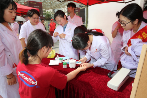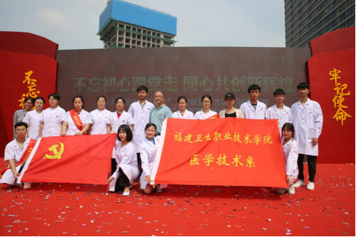 活动当天,医学技术系3名学生代表参与了红歌“快闪”活动的拍摄,用朗朗的歌词,挥舞的旗帜,共同表达了对党对祖国的浓浓情意。医学技术系师生还参与了服务八闽健康义诊活动,提供了中医问诊、推拿拔罐、血糖血压测量、养生茶包捐赠等服务,并协助省血液中心做好无偿献血引导和志愿服务。