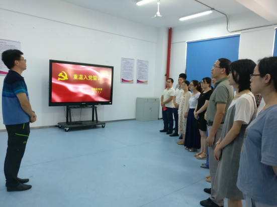 接着由党总支专职组织员叶家涛同志领誓,全体党员紧握右拳,面对着鲜红的党旗重温入党誓词:“我志愿加入中国共产党,拥护党的纲领,遵守党的章程……”铿锵的誓词,坚定的承诺,让每一位党员的心灵再次受到震撼和洗礼。