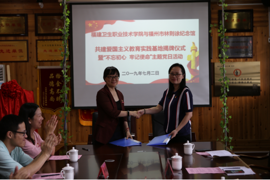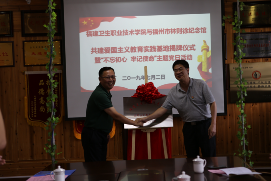 为庆祝中国共产党成立98周年、迎接中华人民共和国成立70周年,大力弘扬林则徐爱国主义精神,7月2日,福建卫生职业技术学院与福州市林则徐纪念馆共建爱国主义教育实践基地揭牌仪式暨“不忘初心 牢记使命”主题党日活动在林则徐纪念馆举行。学院党委书记曾武祈、团委书记黄曦、学生工作处副处长林燕、马克思主义学院名誉院长魏立娜、马克思主义学院直属党支部书记、院长熊美兰及马院全体党员,林则徐纪念馆党支部书记、馆长陈继勇,副书记林虹、副馆长钟田田及林则徐纪念馆党员干部30多人参加活动。马克思主义学院熊美兰院长主持仪式。
