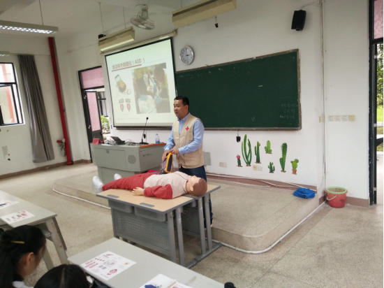 郑明华老师向同学们介绍了福建省红十字会应急救护工作的概况及掌握应急救护技能的重要性和必要性。他用特有的生动和诙谐风格,为同学详细讲解了多种应急救护方案,细致地为同学们介绍了心肺复苏术的适用场景和操作要点,借助安妮假人现场示范,展示如何呼救、如何正确拨打急救电话、召集大家共同参与急救、胸外按压、开放气道、人工呼吸等一系列操作,同时现场演示了AED除颤仪的使用方法,为同学们带来了实用的一课。