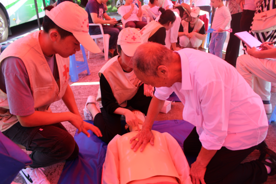 学院红十字志愿者耐心细致地向大家介绍急救包扎方法,运用安妮假人现场展示心肺复苏术操作,讲解实施心肺复苏术的操作要点,活动现场,从小学生到七旬老者都认真学习,并纷纷尝试操作,大家充分认识了掌握急救知识和技能在日常生活中的必要性,全社会参与关爱生命,守护健康的理念深入人心。