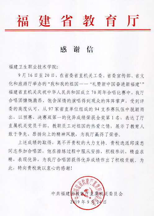 在由省委省直机关工委、省委宣传部、省文化和旅游厅举办的“我和我的祖国——‘礼赞新中国奋进新福建’”福建省直机关庆祝中华人民共和国成立70周年合唱比赛中,省教育厅合唱团取得预赛、决赛双第一的优异成绩,最终荣获金奖第1名。我院选派的邱滚忠同志作为省教育厅合唱团一员,在排练过程中精益求精,表现优异,为合唱团获得优异成绩作出积极贡献。