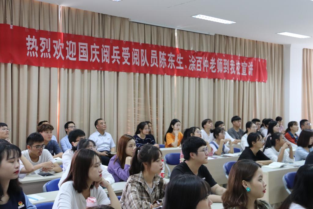 陈东生、涂百仲两位老师作为预备役部队方队中的一员,在庆祝新中国成立70周年阅兵仪式中接受了党和人民的检阅。两位老师同师生讲述了在参加阅兵典礼过程中的各种酸甜苦辣。阅兵村极其严格的集训,破了脚茧、肿了脚踝和胯骨、天安门前的96米要踢出128步,用时1分04秒的高标准和超40秒不眨眼,无不震撼了在场师生,掌声阵阵。