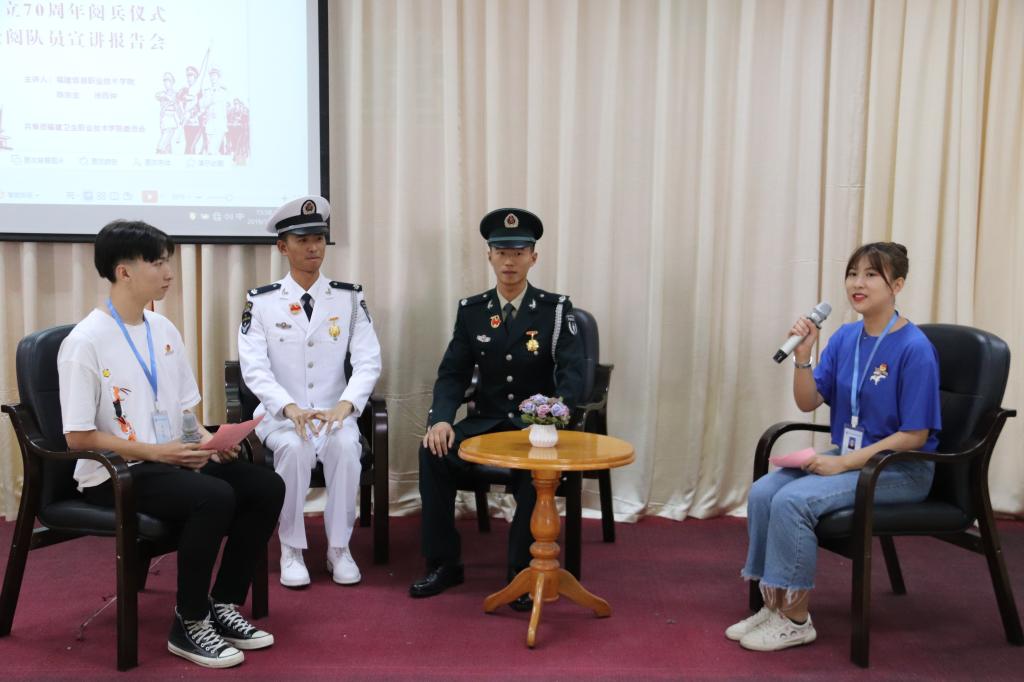 70年来,一代又一代中华儿女披荆斩棘、奋勇拼搏,创造了这壮丽的新时代、创造了一个又一个举世瞩目的中国奇迹。来自福建信息职业技术学院的陈东生、涂百仲两位老师给我校师生带来的阅兵精神激励着我们,让我们不忘初心,牢记使命,在学用结合、知行合一中不断提升自我修养和道德境界,努力学习。