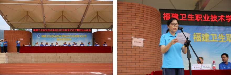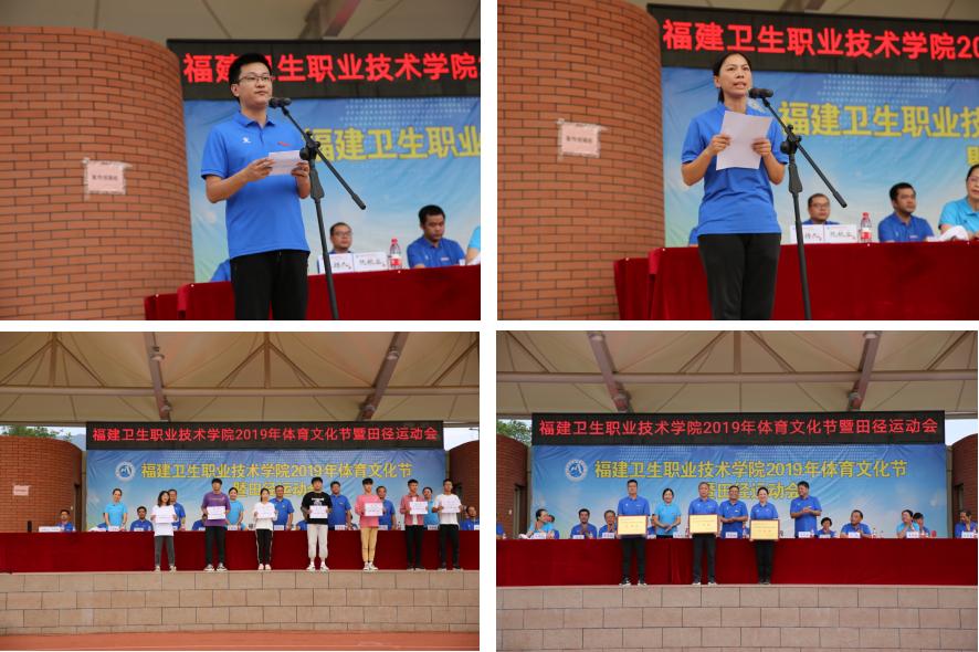 在高亢激扬的进行曲中,国旗、校旗护旗队、牌队、彩旗队、花队和各班级代表队在田径场就位。组委会副主任宋维宣读系部组织奖、系部体育道德风尚奖、班级体育道德风尚奖获奖、学生优秀教练员及优秀裁判员名单。副总裁判长邓素华宣读第九套广播体操、功夫扇获奖集体、学生体育明星、学生班级团体总分和名次、学生系部团体总分和名次,教职工团体总分和名次。校领导为获奖单位和个人颁奖。