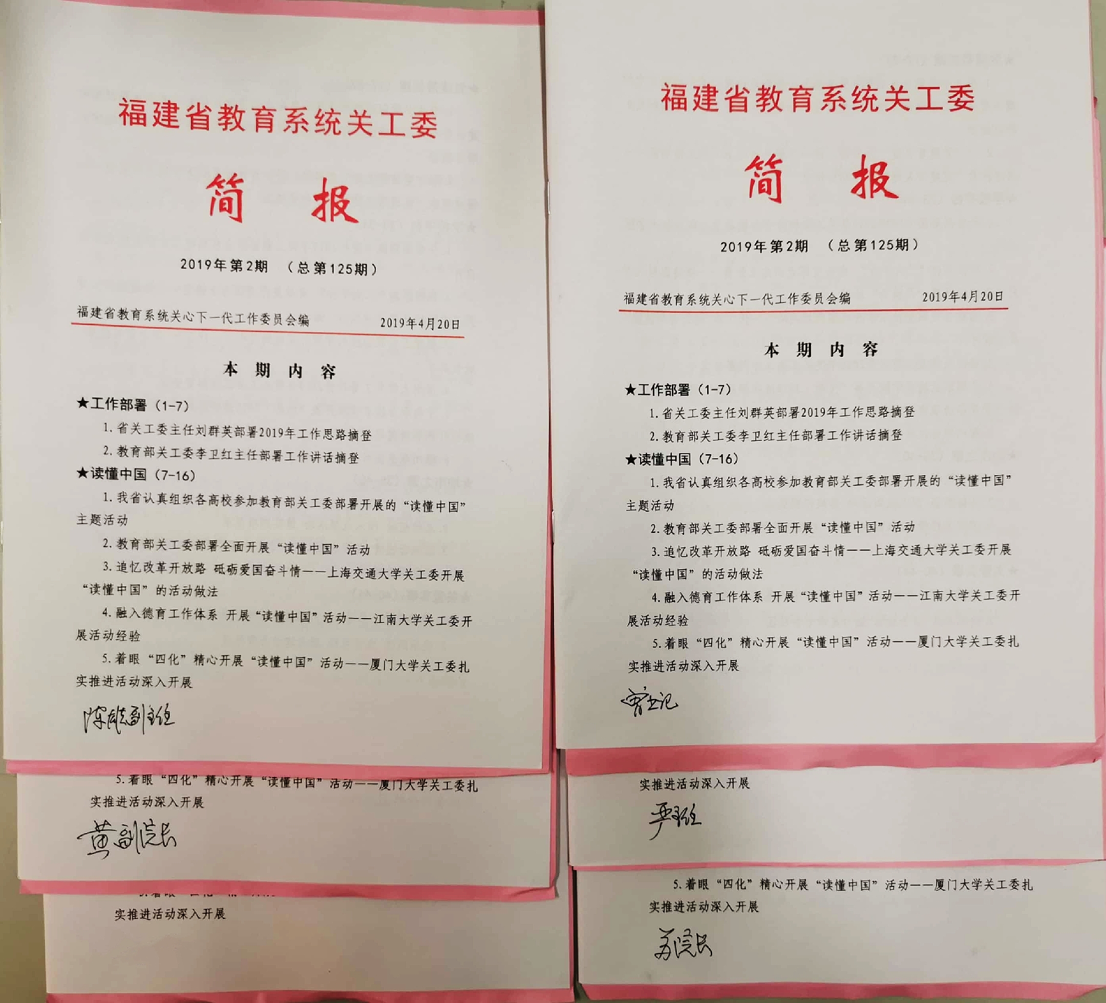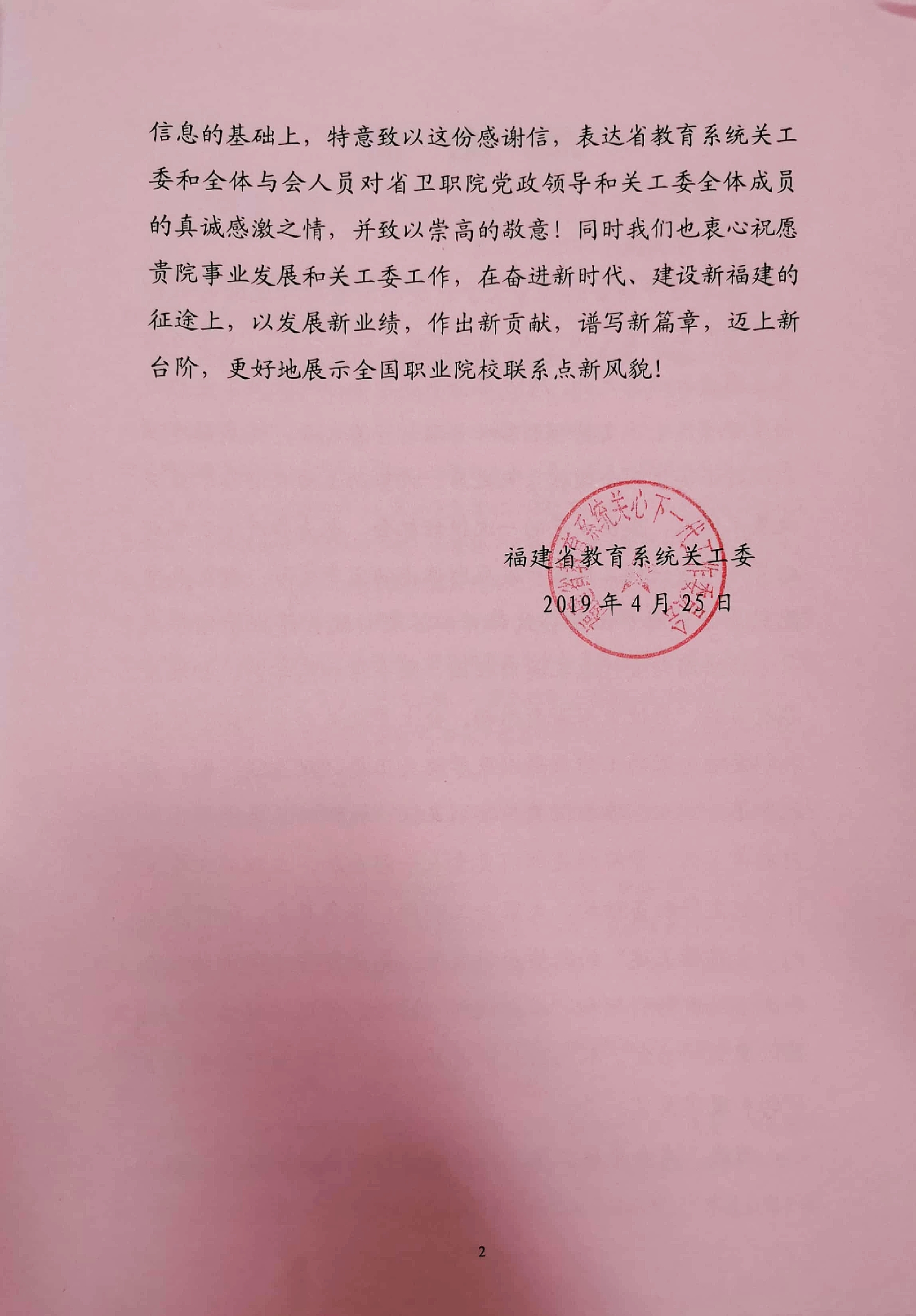 近日,我院关工委收到了来自福建省教育系统关工委2019年第2期的简报以及感谢信,感谢我院全力支持2019年全省高职高专院校关工委协作会的召开,并取得可喜成果,并衷心祝愿我院事业发展和关工委工作谱写新篇章,更好地展示全国职业院校联系点新风貌。
