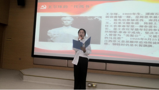 “一夜风云变,上海大屠杀。尔琢拔刀起,血誓效讨伐。革命不成功,此生不剃须。” 主播魏雨馨演绎着《王尔琢的“托孤书”》,触动台下观众的心灵,让同学们感受到一个有血有肉、至情至性的共产党人形象。