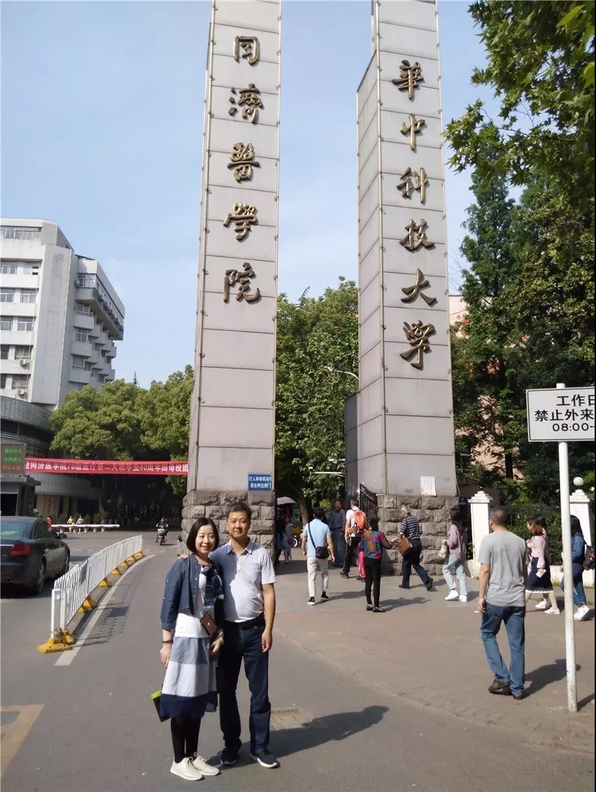 洪霞和黄峥慧在母校华中科技大学同济医学院校门口合影