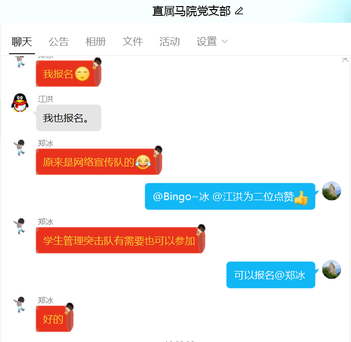 马克思主义学院当晚在工作群中发出组建突击队通知,系里59岁党员教师魏立娜第一个报名。马院院长说:“魏教授是我们系年纪最大的党员教师,今年6月就要退休了,真的很感动,深夜12点了,通知一出,她第一个报名。这带动了我们系里很多年轻的党员教师。上学期末刚刚从辅导员岗位转到我们马院的郑冰老师报名时说自己参加过系里网络宣传队,可以参加学校的宣传教育突击队,也干过学生管理,学生管理突击队也可以参加,哪里需要就去哪里。还有一些老师,身体不好,家庭负担重,但都第一时间报了名。这个时候,真的感受到,每一位党员就是一面旗帜。”