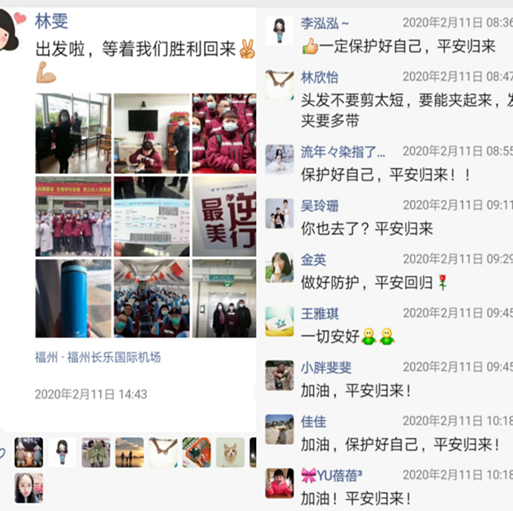 她们虽不同在一个地方,每天战“疫”归来,却不忘互相问候,互相打气,因为她们都明白这是一场无硝烟的战“疫”,必将不负众望,平安归来!