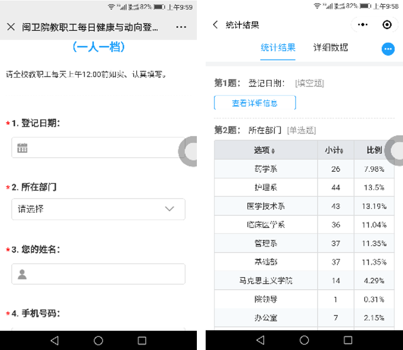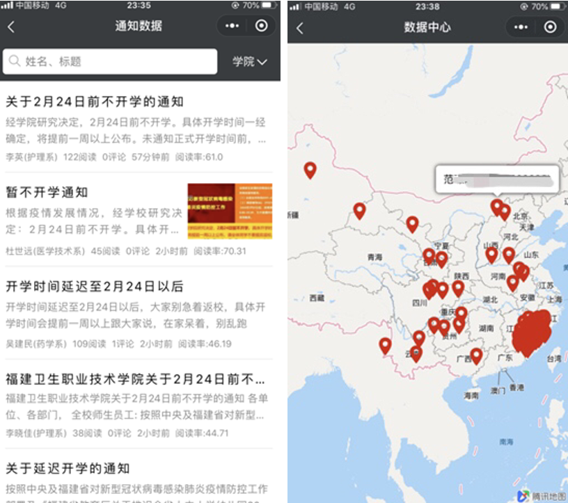 针对疫情防控形势下,师生各口径均有数据报送需求,日打卡、微信接龙等“初级信息化”方式,效果不理想。现代教育技术中心经多方对比、查询,帮助人事处选择市面上成熟的 “问卷星”完成教师个人报告体温、返榕,疫源接触等内容快速填报,实现数据汇总、归类,并能点对点通知未完成人员。一通百通,人事处借助此平台推出系列报表,涵盖在职、退休、外聘任等人员群体。帮助学生工作处选用了微信小程序“我在校园”进行数据信息化报送,使学生管理部门可以即时获取通知送达情况,清晰获得学生签到时所处的位置,更好地为学生的健康安全保驾护航。