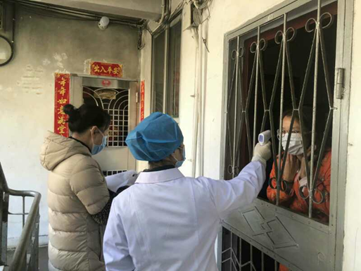 预防班林芬(中间)参与居家隔离人员测量体温工作