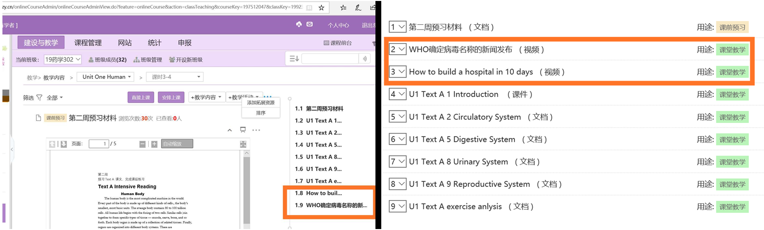 林速容老师把世界卫生组织确定新冠病毒命名和火神山雷神山医院如何快速建立的视频,结合医学基础英语的教学内容,作为教学资料上传至天使之城学习平台,供学生学习。学生在学习新冠病毒的相关英文表达的同时,了解到什么是“中国速度”,了解到我们国家“集中力量办大事”的制度优越性,我们完全有能力有信心战胜疫情。