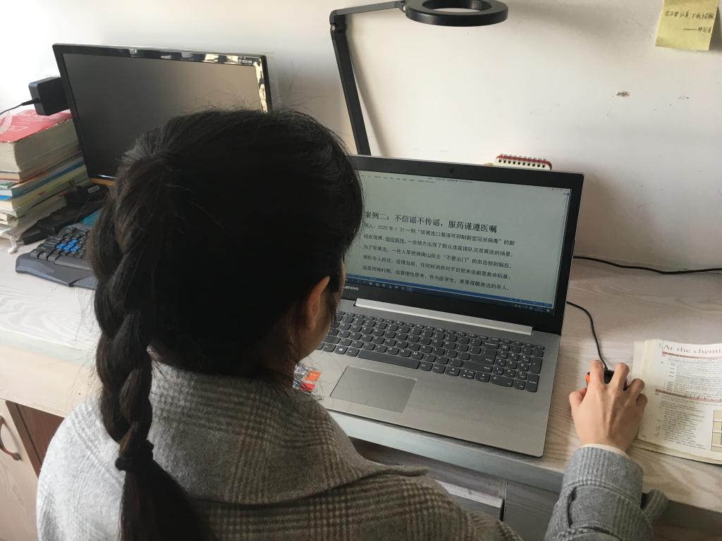 黄海云老师在整理“Don't believe rumors. Don't spread rumors. Don't create rumors.”(不信谣,不传谣)的教学内容,实施课程思政,鼓励学生在疫情期间,面对病毒,科学了解,积极防御,面对恐慌,更要做到不传谣不信谣,传播正能量。