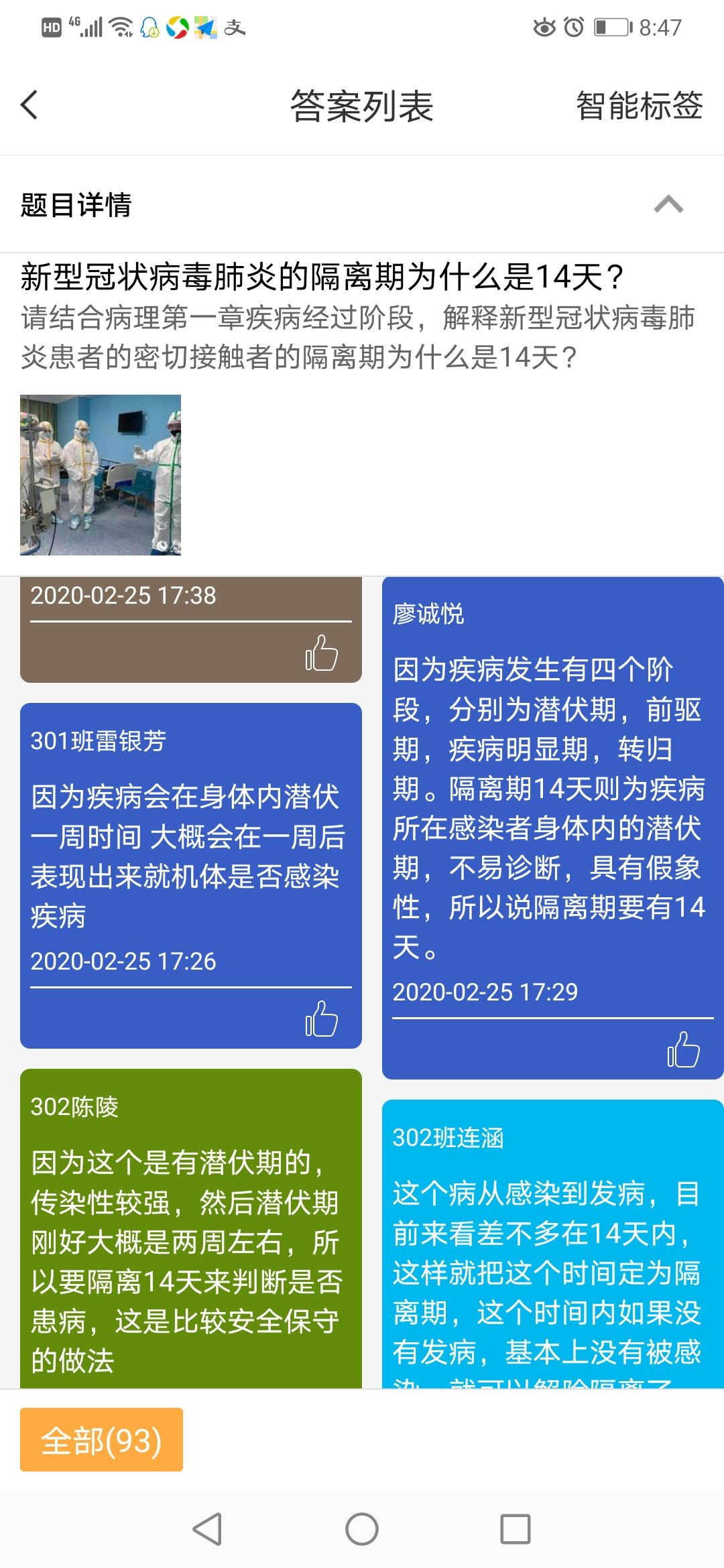病理教研室的党员教师在病理学课程教学中,针对知识点疾病的经过“潜伏期”,引导学生思考新冠肺炎为什么要有隔离期?通过讨论使学生明白:新冠肺炎有潜伏期,人群中处于潜伏期的人极易成为感染源,这也是为什么国家号召大家不出门,这既是保护自己也是保护他人。通过学习,让学生知其然,知其所以然。