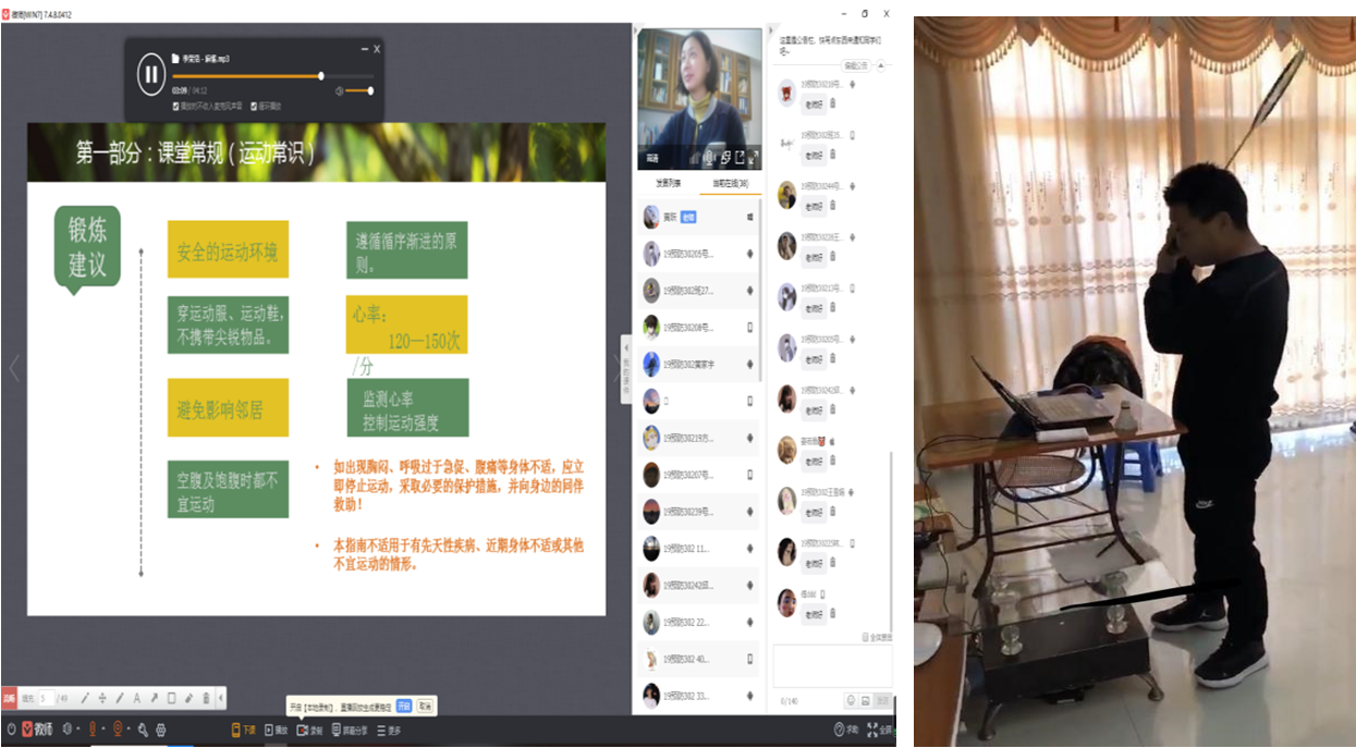 线上教学难不倒咱们的体育老师。云班课、QQ直播、微师等多种软件,体育老师也是信手拈来,利用各种教学平台直播讲解相关理论知识,一改大家认为体育课只能面授的旧观念,没有操场、没有篮球场,我们照样能high。