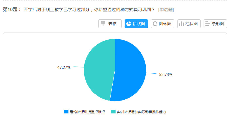 此外,16.21%学生更喜欢线上教学,38.95%的学生喜欢使用线上资源进行线上线下混合式教学,由此可表明学生对线上线下混合式教学改革的认可。对于线上教学已学习过部分,52.73%的学生希望开学后再通过理论补课讲授重点难点,47.27%的学生希望开学后通过实训补课增加实际动手操作能力。