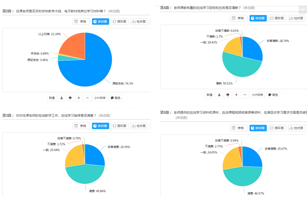 为了解学生参加在线学习的情况,学校教务处向所有参加前两周在线学习的学生发放在线调查问卷。对在线教学教师的教学工作情况进行调查,7187名在校学生参加问卷调查,72.43%的学生对在线教学表示满意。