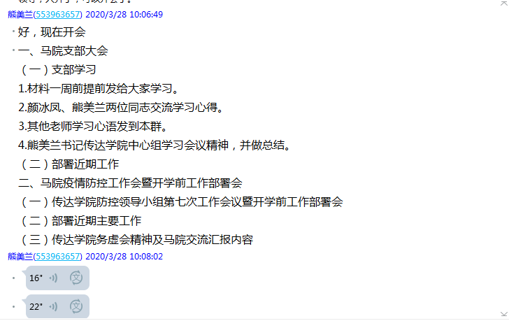 2020年3月28日上午,直属马克思主义学院党支部召开线上党员大会,集中学习《新时代高等学校思想政治理论课教师队伍建设规定》《教育部有关部门负责人就<新时代高等学校思想政治理论课教师队伍建设规定>答问》等6份文件。会议由党支部书记熊美兰主持,全体教师党员参加了会议。教师们在会议上畅谈心得和感想,掀起学习讨论热潮。
