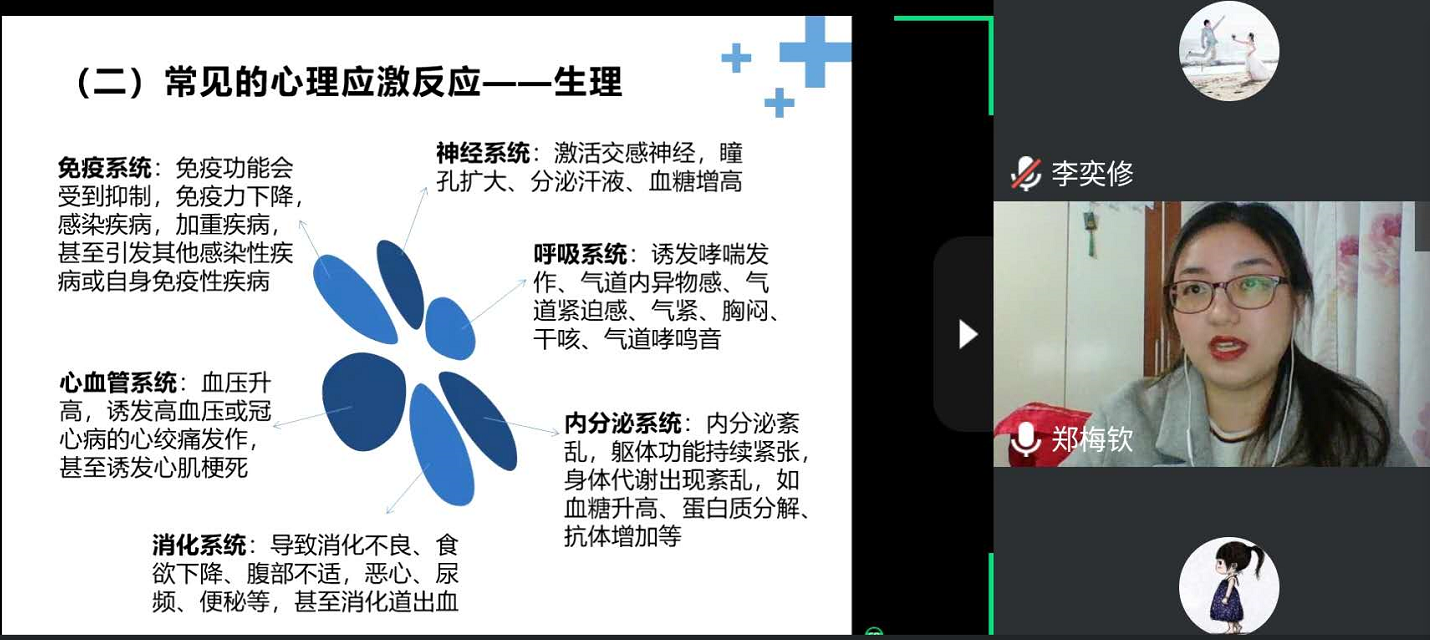 郑梅钦老师从著名的哲学家休谟的名言“存在的都是有原因的”切入,结合新冠肺炎疫情暴发后产生的大量应激反应,为大家分析应激反应产生的身心保护机制,缓解因疫情应激带来的心理焦虑。