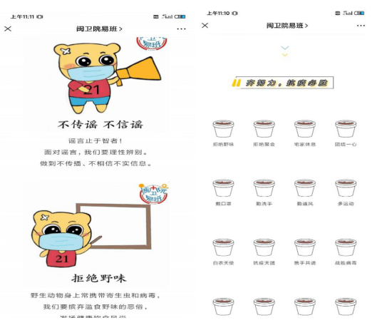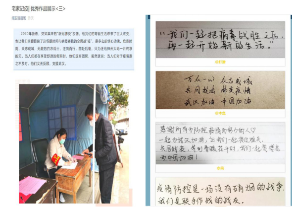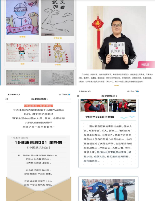 编制学生思想“防护服”。为落实学院疫情防控工作要求,扎实做好疫情防控期间学生的教育管理服务工作,易班发展中心充分利用新媒体矩阵,发挥网络平台优势,主动发声、正面引导,以科学防疫为主题编织“防疫信息网”,以爱国主义教育为主题编织“防疫思政网。通过策划组织防控疫情系列活动,鼓励广大师生在线制作网络文化作品。开展“为武汉手写祝福”活动,号召广大学子用手中的笔写下祝福,致敬抗疫一线,活动累计收到作品两百多份;号召在校辅导员老师为分布在全国各地的学生送去暖心问候和关爱,短短两小时内就收到了二十几个老师精心准备的作品,将收集到的作品以《@卫院学子,易同战“疫”,辅导员有话对你说!》发布在公众号上,为远方的学生送去冬日里的温暖;在“易班”APP发起“防疫知识竞赛”活动,开展“宅家记疫”主题征文和“共抗肺炎,易齐助力”活动,两个活动共计收到了近千份,同学们用文字和短视频记录下了居家抗疫中的所做所见所感;还以学生喜闻乐见的形式设计制作“闽卫院防疫表情包”和“闽卫院专属小瓶子”等作品,在学生朋友圈广泛传播。