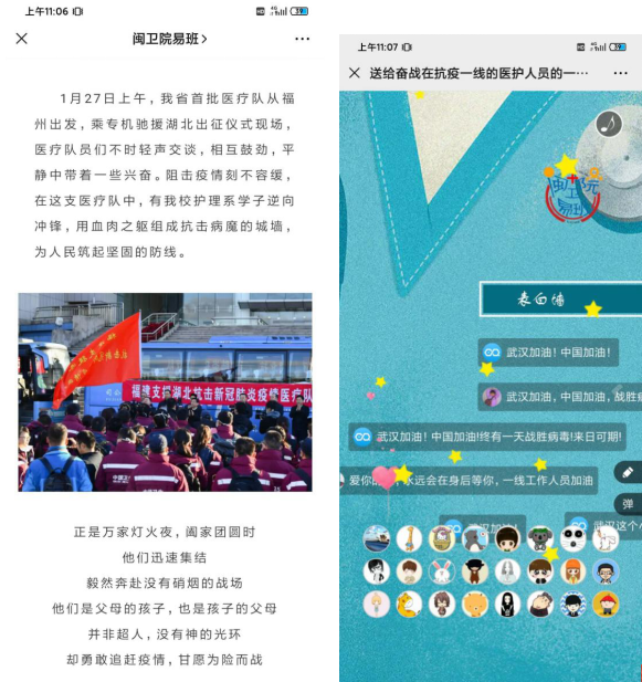 构筑思想政治“同心圆”。易班中心及时抓住全国上下抗击疫情这部实践教材、这堂实践大课,开展对大学生的思想引领。先后转发《逆行!向着疫情冲锋的闽卫学子!》和《苟利国家,祸福不避 | 致敬,向疫情冲锋的闽卫人!》两篇文章,深入挖掘我院校友赶赴疫情一线的典型事迹和感人故事,抒发抗击疫情期间难以忘怀的坚守、携手并进的奋战、守望相助的关爱和万众一心的感动。在2月14日情人节之际,易班发起了“一封写给奋战在抗疫一线医护人员的特别情书”活动,表白对抗疫一线医护人员的感谢。发布了《一封写给奋战在抗疫前线校友的家书》,用温暖的文字为校友们送去母校的关心和问候。