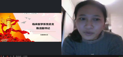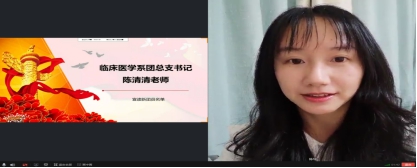 临床医学系部党总支陈洁副书记对新团员们表示热烈祝贺并对他们在以后的学习和工作中寄予希望:一是希望同学们理论学习和实践工作相结合,在实际中反思问题并解决问题、总结经验,提高自身的创造力、战斗力以及基层团支部的凝聚力和向心力;二是希望同学们能坚持共产党的领导,提高对实际工作能力的培养;三是希望各位团员们可以积极应对新形势下共青团面临的新挑战、新任务,不断开拓创新,锐意进取,开创我校共青团建设的新局面。