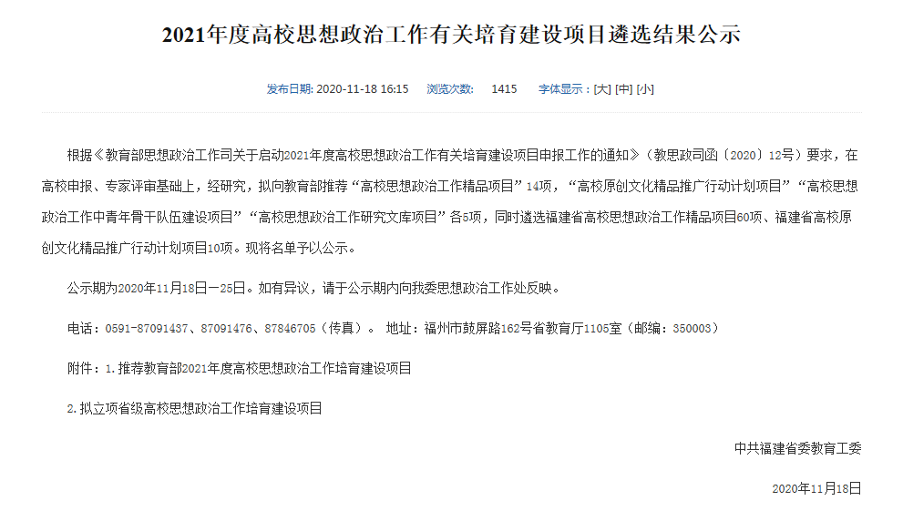 近日,中共福建省委教育工委2021年度高校思想政治工作有关培育建设项目公布了公示名单,我校学生工作部资助管理中心申报的“‘天使文化,大爱无疆’融入资助育人实践探索”项目,拟立项省级高校思想政冶工作培育建设项目,并且拟作为我省“高校思想政冶工作精品项目”向教育部推荐。特别值得一提的是:我省拟向教育部推荐的精品项目共14项,其中13项均为本科院校项目,我校学生工作部申报的项目,是唯一一所高职院校项目。