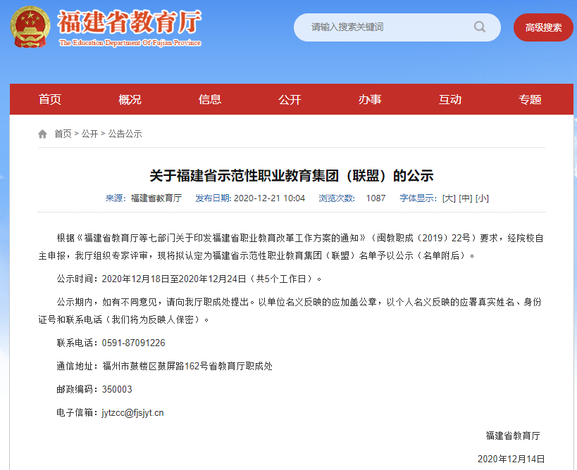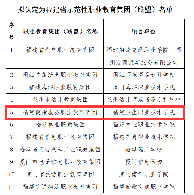 根据福建省教育厅《关于福建省示范性职业教育集团(联盟)的公示》,由我校牵头组建的福建健康服务职业教育集团获评福建省示范性职业教育集团。据悉,本次全省共有11所职业教育集团被认定为示范性职业教育集团。