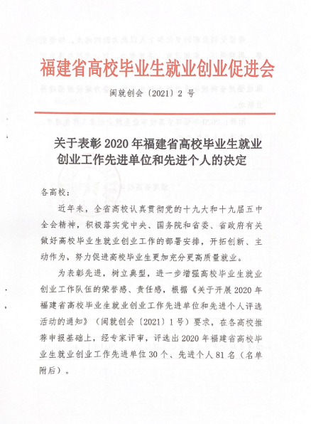 2021年1月15日,福建省教育厅、福建省人社厅联合召开2021届高校毕业生就业创业推进会。会上表彰了2020年我省高校毕业生就业创业工作先进单位和先进个人,我校喜获全省高校毕业生就业创业工作“先进单位”荣誉称号,董东同志喜获全省高校毕业生就业创业“先进个人”荣誉称号。